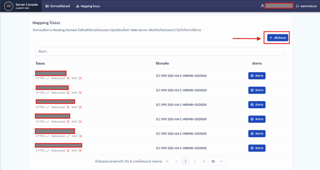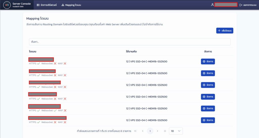 ระบบจะแสดงรายการโดเมนที่เราได้ทำการเพิ่มไปก่อนหน้า หากยังไม่มีก็จะขึ้นว่าไม่มีข้อมูลโดเมน