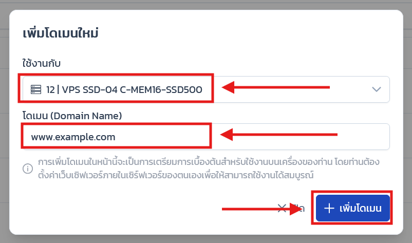 จากนั้นเลือก VPS ที่จะใช้กับโดเมนและ ระบุโดเมนที่จะใช้งาน เช่น www.example.com แล้วคลิก เพิ่มโดเมน