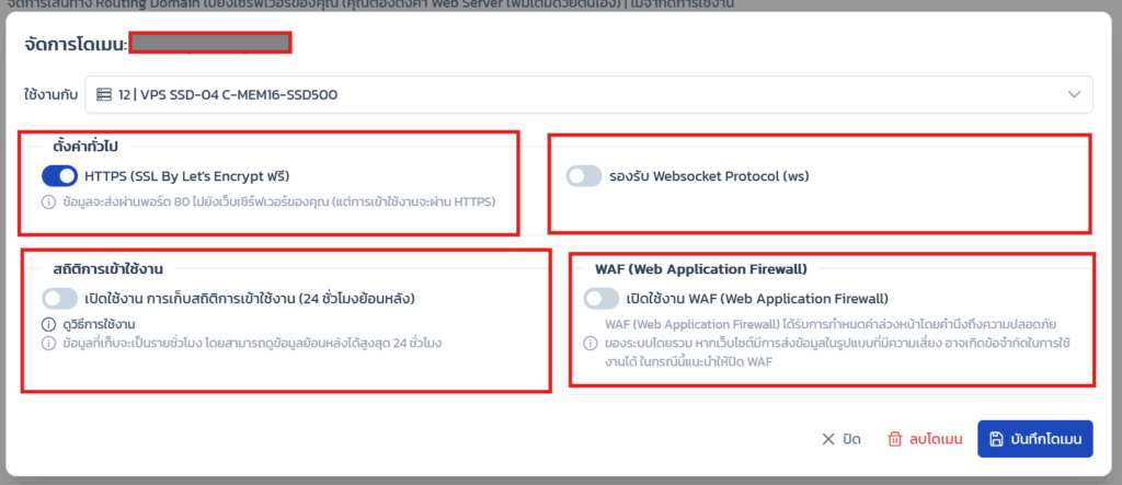 หากต้องการใช้อันไหนให้ทำการเลือกเปิดเพื่อใช้งานได้เลย และเมื่อจัดการเรียบร้อยให้ทำการคลิกบันทึกโดเมน
